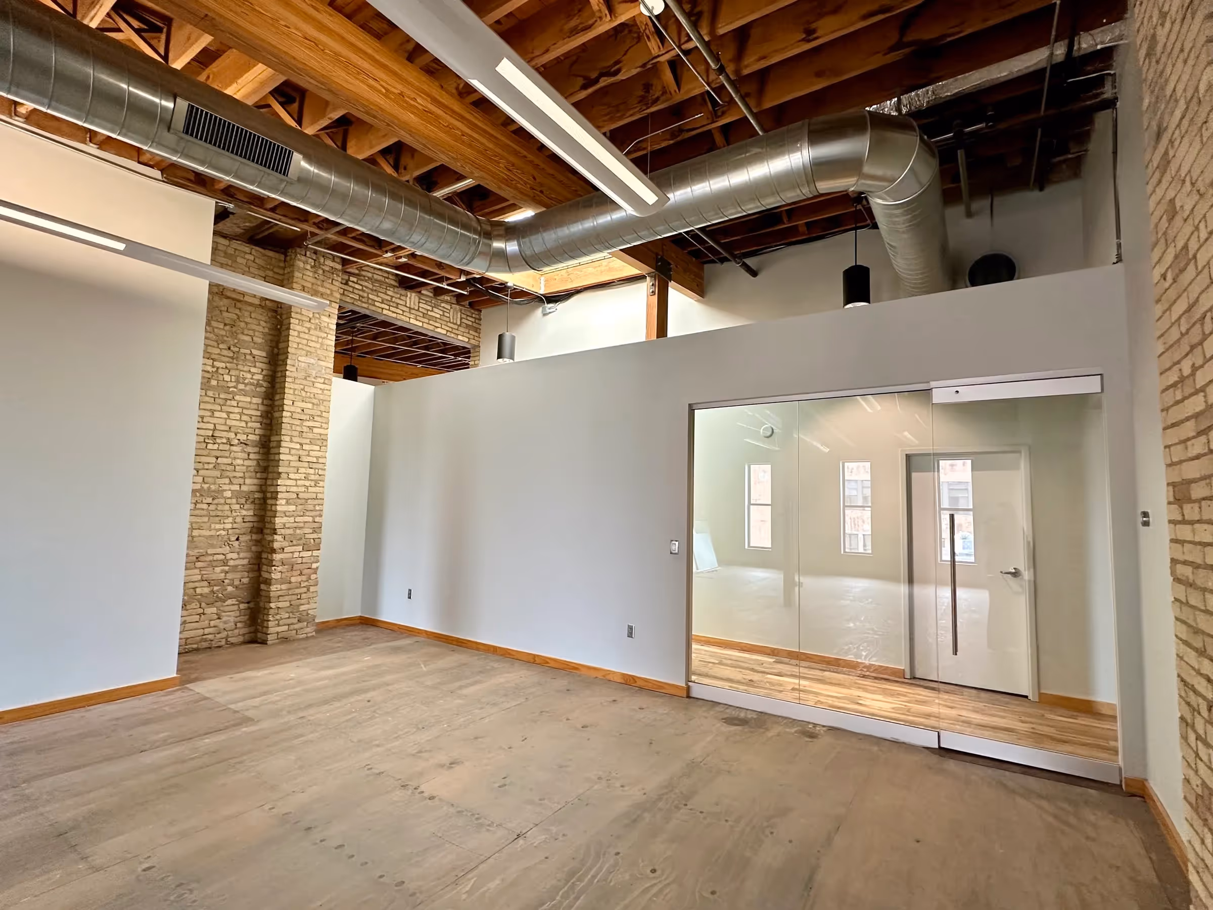 Third-floor creative office suite in the North Loop with shared common areas and amenities.