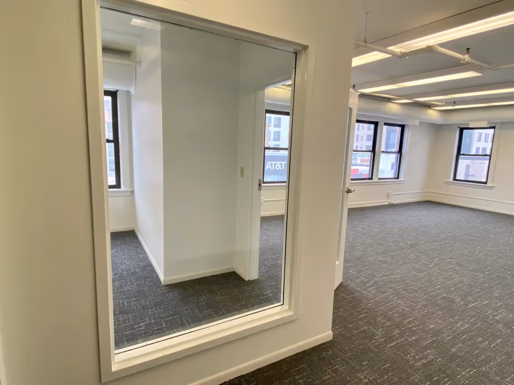 Corner office space on the second level of the Rainbow Building in Uptown.