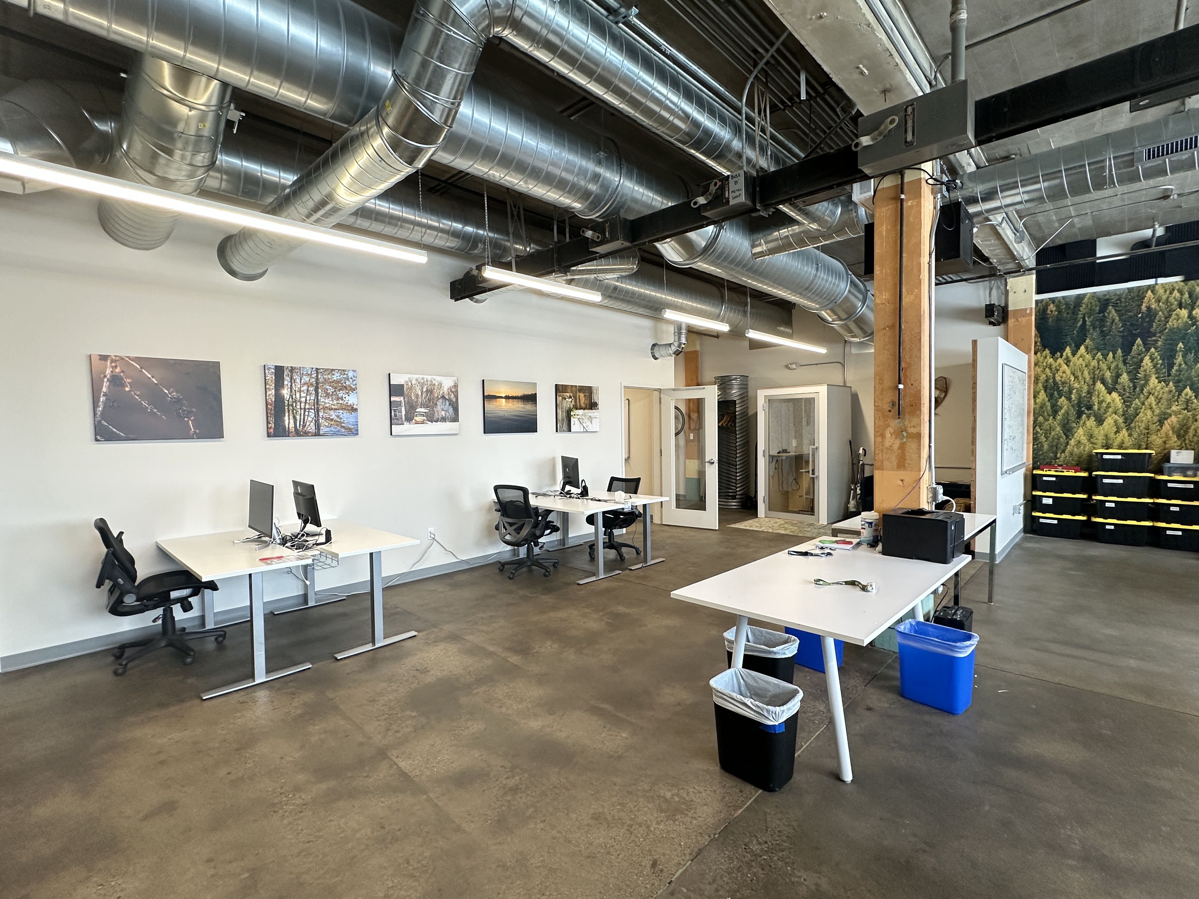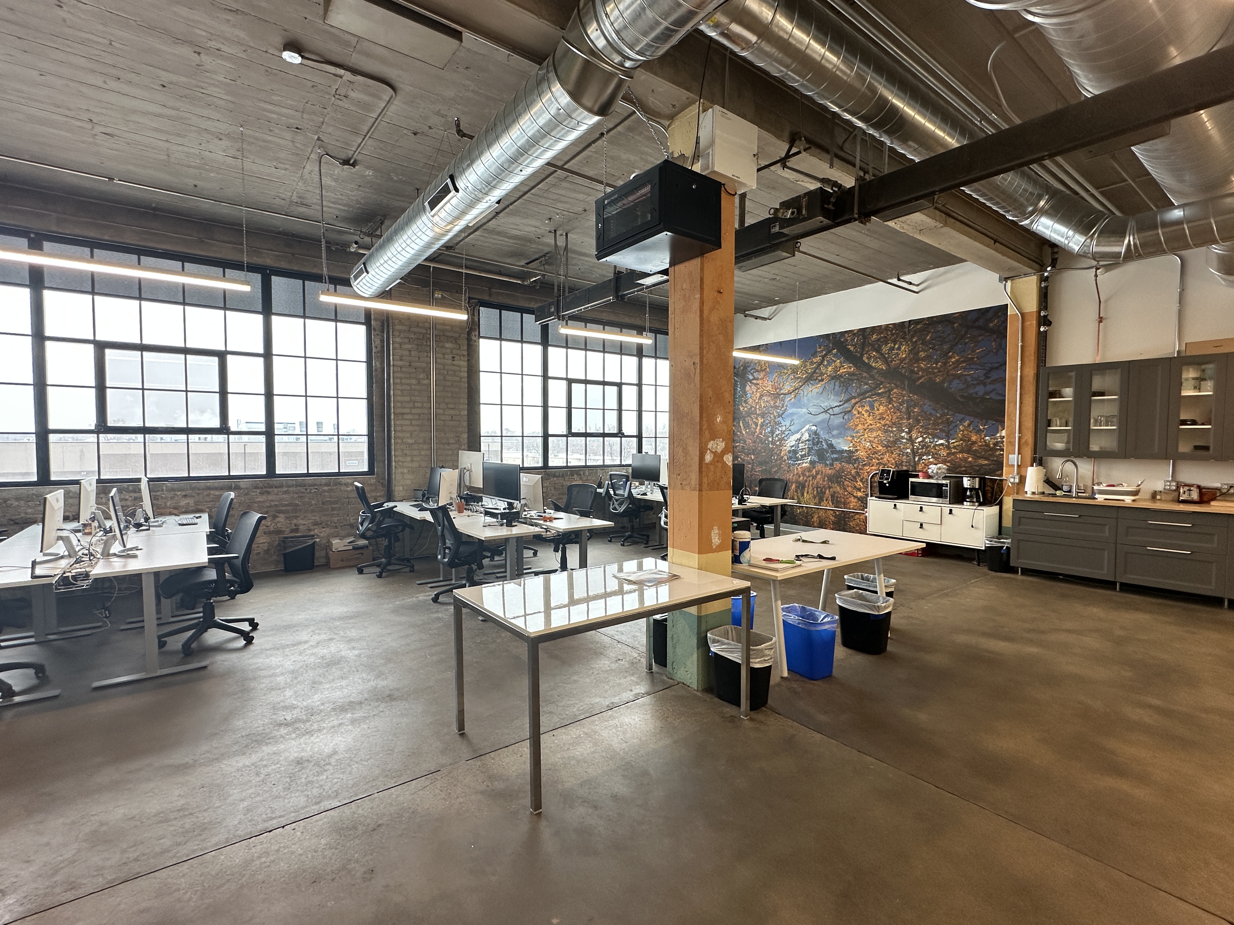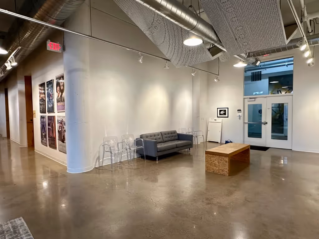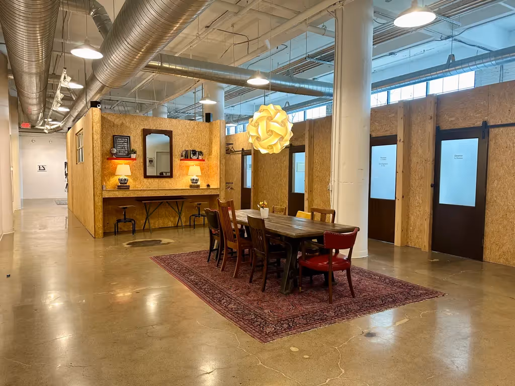 With its unique and esoteric mix of dynamic maker tenants, Vandalia Tower is home to a community of creatives, small businesses, and artists. The entrepreneurial energy is felt at the forefront, with local photography and pops of color from vibrant artwork throughout the building's lobby and common areas. Sunlight pours into all three levels of the building through large industrial windows and skylights, providing a light, airy, industrial feel in combination with white walls, exposed beams, and a mix of hardwood and polished concrete floors.
